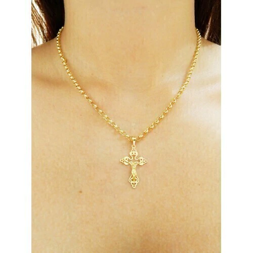 PINGENTE CRUZ COM CRISTO TRABALHADA 1,55GR EM OURO 18K